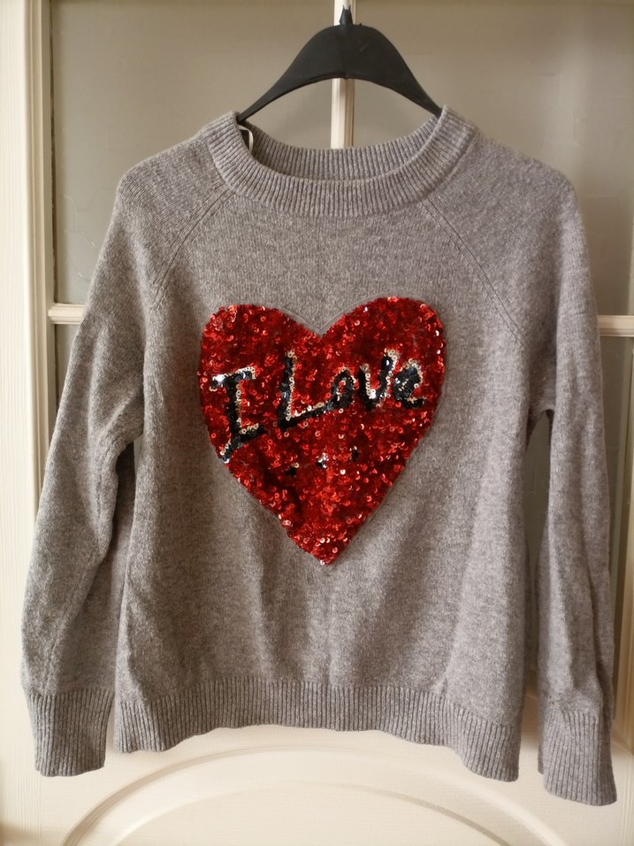 Gri renkte, triko kumaştan, uzun kollu ve bol kesim bir kazak. Önünde "I Love" yazılı kırmızı payetli kalp deseni bulunuyor. ❤️