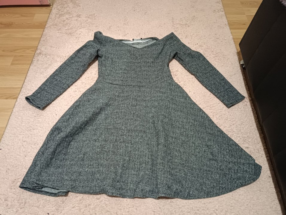 Bu dar kesim gri triko elbise, uzun kollu ve kayık yaka detaylarına sahiptir. Rahat, desensiz ve midi boyda, günlük kullanım için uygundur.