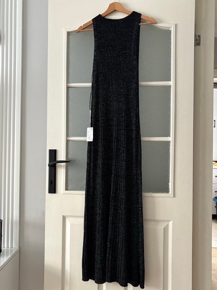 Yüksek yakalı, kolsuz, pilili ve dar kesim gri triko uzun elbise. Rahat ve şık, günlük kullanım için uygundur.