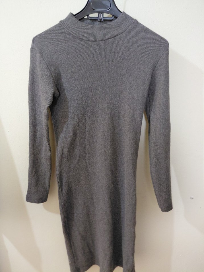 Yumuşak sentetik triko kumaştan, yarım boğazlı ve uzun kollu, gri renkli, vücuda oturan midi elbise.