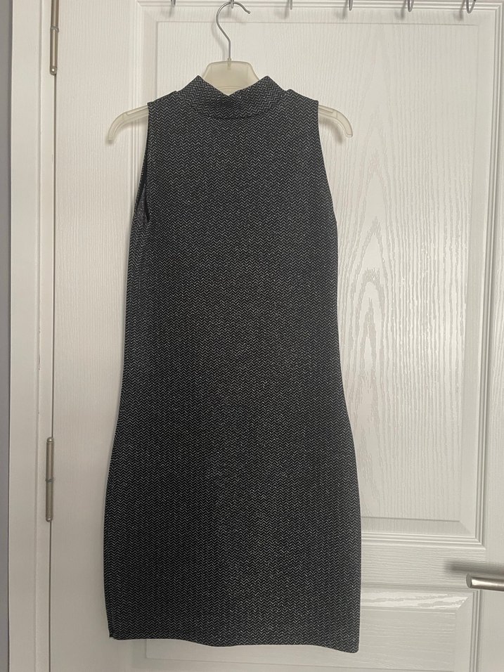 Gri renkte, kolsuz, yüksek yakalı, vücuda oturan ve örme dokulu midi elbise, yumuşak sentetik kumaştan üretilmiştir. Işıltılı kumaşa sahiptir