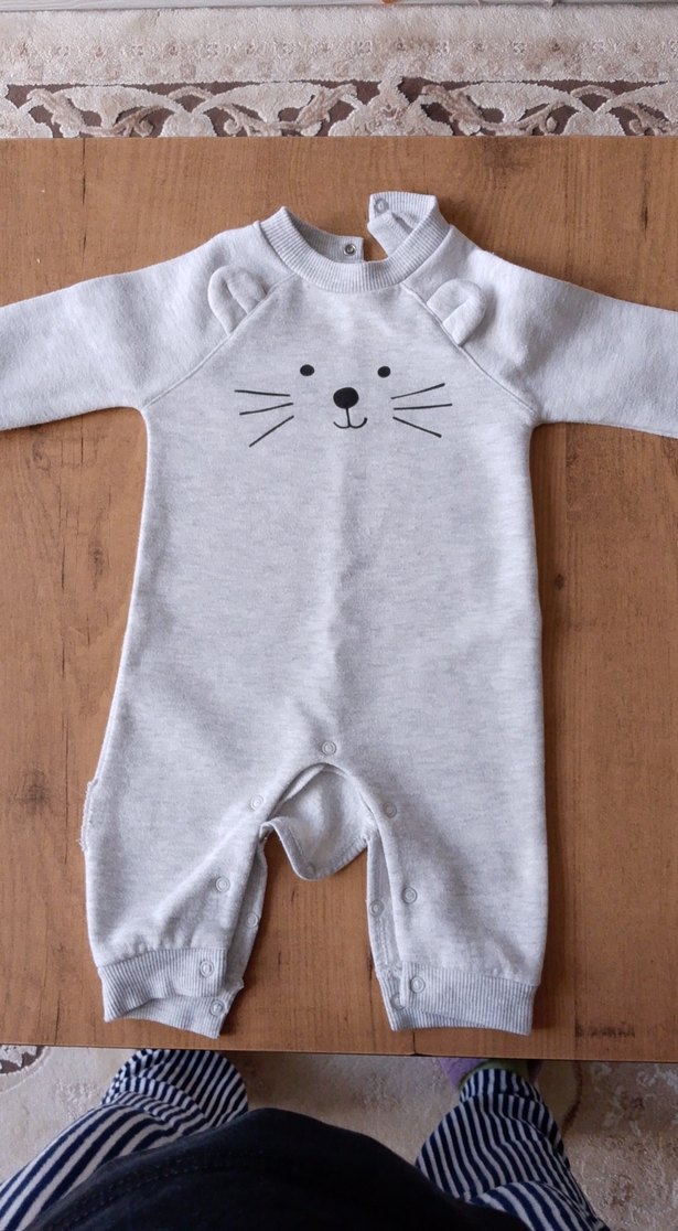 Gri renkli, uzun kollu, yuvarlak yakalı bebek tulumu. Önünde sevimli hayvan yüzü baskısı ve kolay giydirme için çıtçıt düğmeler bulunur.
