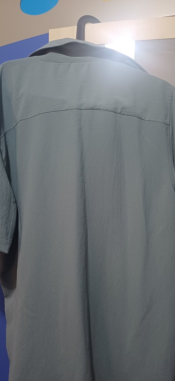 turkuaz ve gri renkte, düğmeli, yaka detaylı, kısa kollu, bol kesim erkek gömleği. Günlük kullanıma uygun, rahat ve sokak tarzı stilinde bir ürün.
