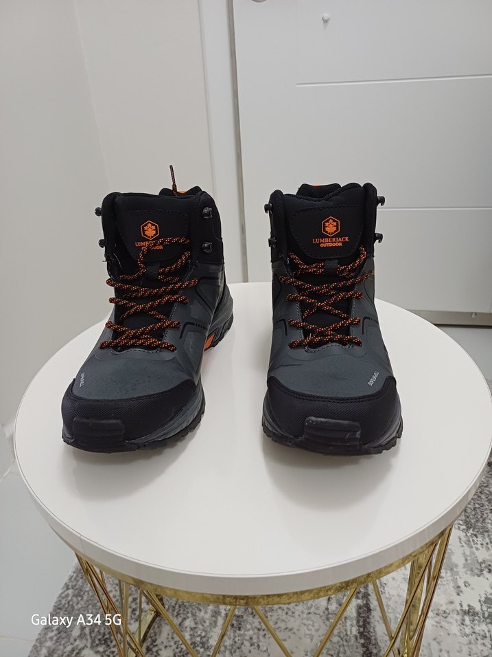 Gri ve turuncu renklerde, su geçirmez bağcıklı erkek outdoor ayakkabısı. Kauçuk tabanlı, trend sokak stiline uygun ve dış mekan kullanımı için ideal. ️