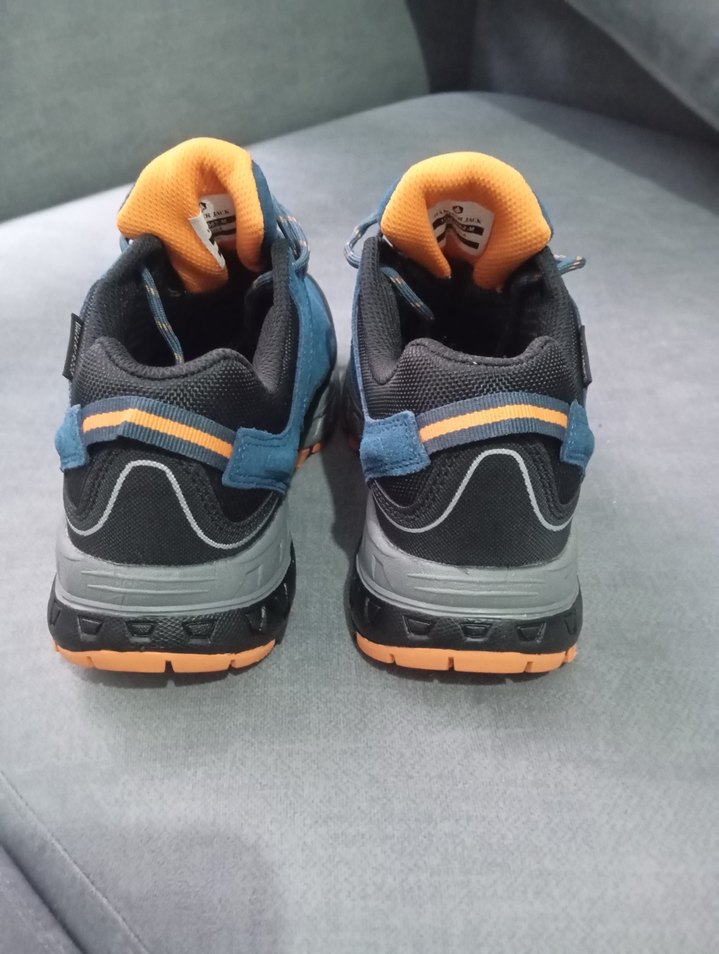 Gri ve turuncu renklerde, baskılı desenli, Velcro bantlı, kauçuk tabanlı erkek spor outdoor ayakkabısı.