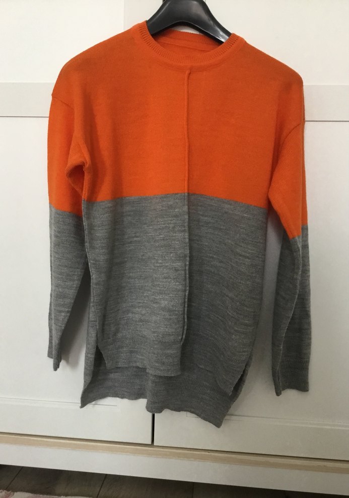 Kadınlar için yuvarlak yaka, uzun kollu ve bol kesim örgü triko. Gri ve turuncu renklerde yün malzemeden, günlük kullanıma uygun rahat ve modern tasarım.