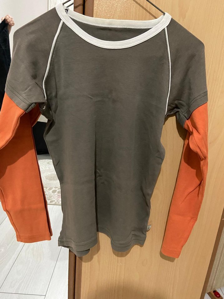 Bu dar kesim hamile tişörtü, uzun kollu ve yuvarlak yakalıdır. Gri ve turuncu renkleriyle sokak modası tarzında, sentetik kumaştan üretilmiştir, günlük kullanıma uygundur.