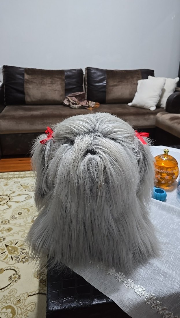 Gri tüy detaylı, bağcıklı ve tie-dye desenli köpek kıyafeti. Yumuşak uzun tüylü, kırmızı fiyonklarla süslenmiş.