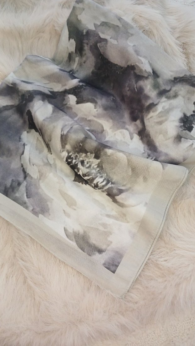 Kadınlar için gri tonlarında, ipek dokulu ve tüy detaylı, çağdaş ve rahat bir stil sunan fular.