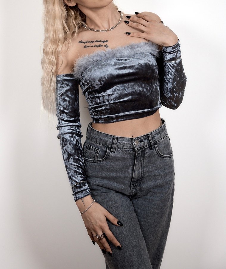 xs-s-m bedenleri mevcut siyah ve mor renkleri mevcut kadife kumastan üretilmistir modelin üzerindeki ürün s bedendir Uzun kollu, straplez, gri kadife kumaştan yapılmış, kürk detaylı ve sokak stiline uygun fitted bluz.