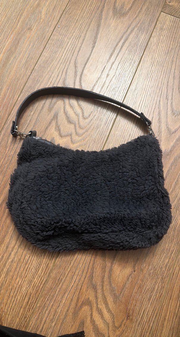 Yumuşak tüylü kumaştan yapılmış, sade tasarımlı koyu gri kadın çantası, günlük kullanım için uygundur.