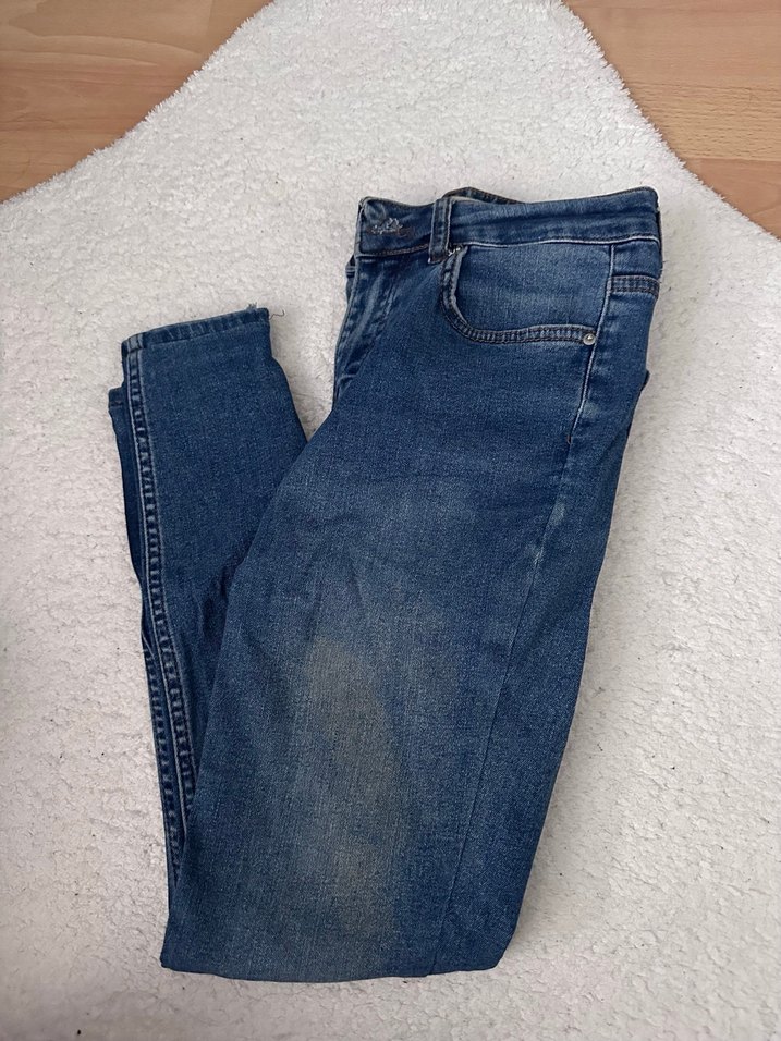 Gri tüylü detaylara sahip, midi boy, fitted kesim mavi kot pantolon. Günlük kullanıma uygun, rahat ve şık sokak stili için ideal.