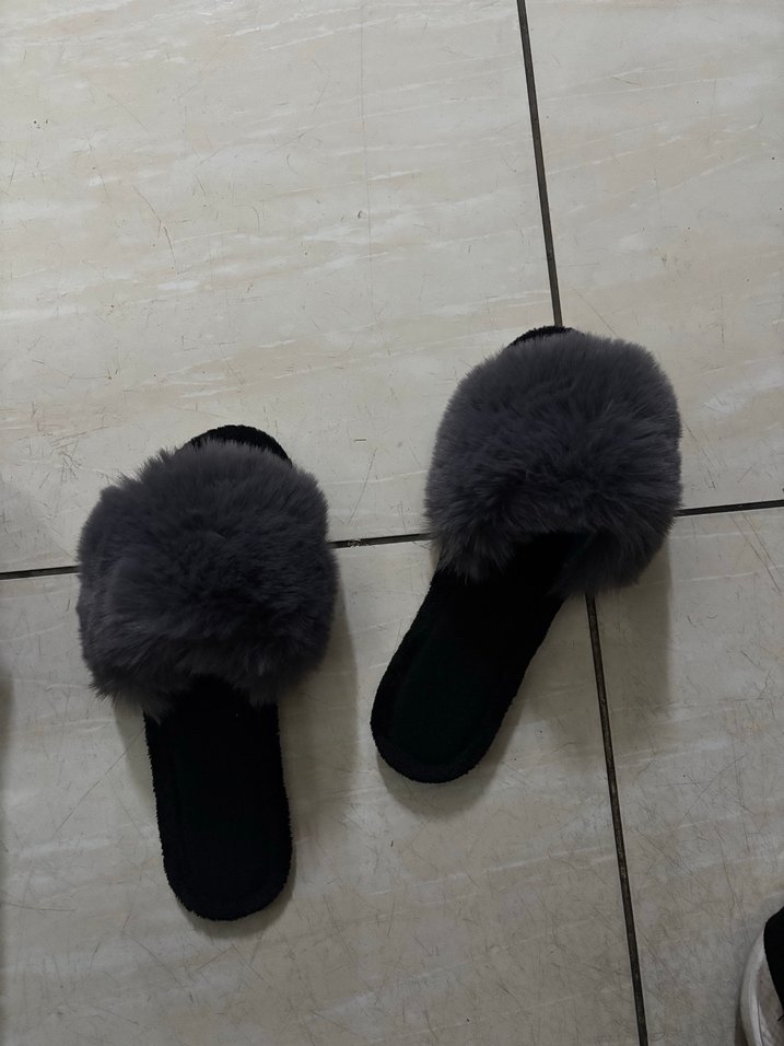 Gri tüylü detaylı, yumuşak kumaştan kadın terlik, ince topuklu ve günlük kullanım için uygundur.