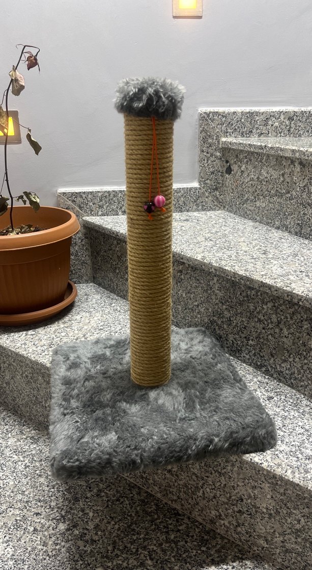 Gri tüylü tabanı ve ip sarılı direği bulunan, asılı top oyuncağı ile kedi oyuncağıdır.