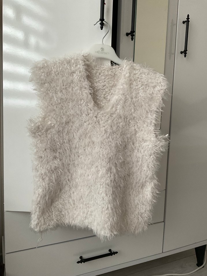 Yün malzemeden yapılmış, tüylü dokulu, V yakalı ve kolsuz gri süveter. Rahat kesimiyle günlük kullanıma uygun, sokak modasına uygun tarzda. El işlemesidir.