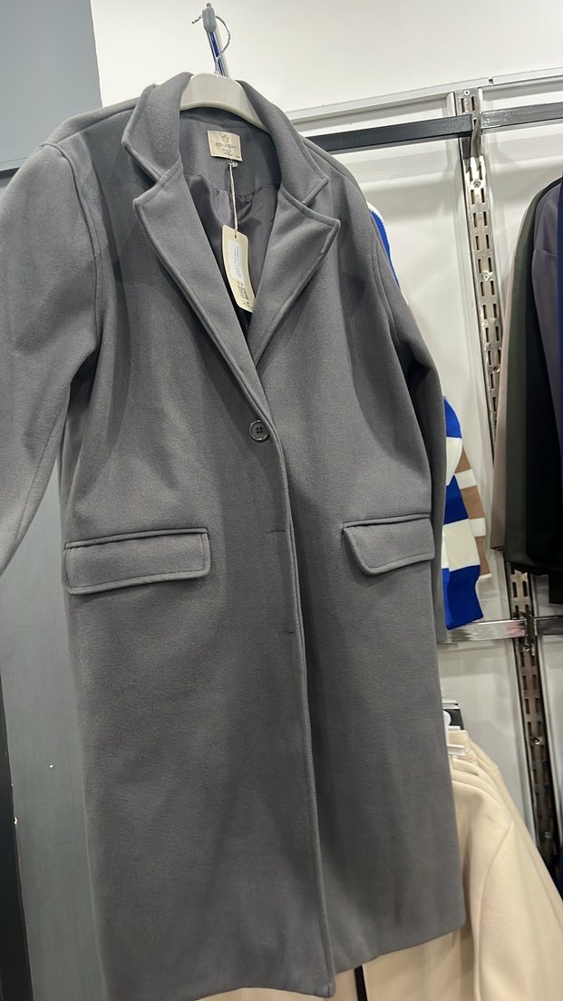 Gri renk, üç düğmeli, yaka detaylı ve kapaklı cepleri olan, iç kısmı astarlı kaban.