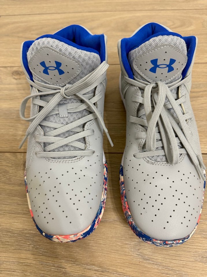 Bağcıklı tasarıma sahip gri Under Armour basketbol ayakkabısı, renkli tabanıyla sportif ve günlük sokak stiline uygun.