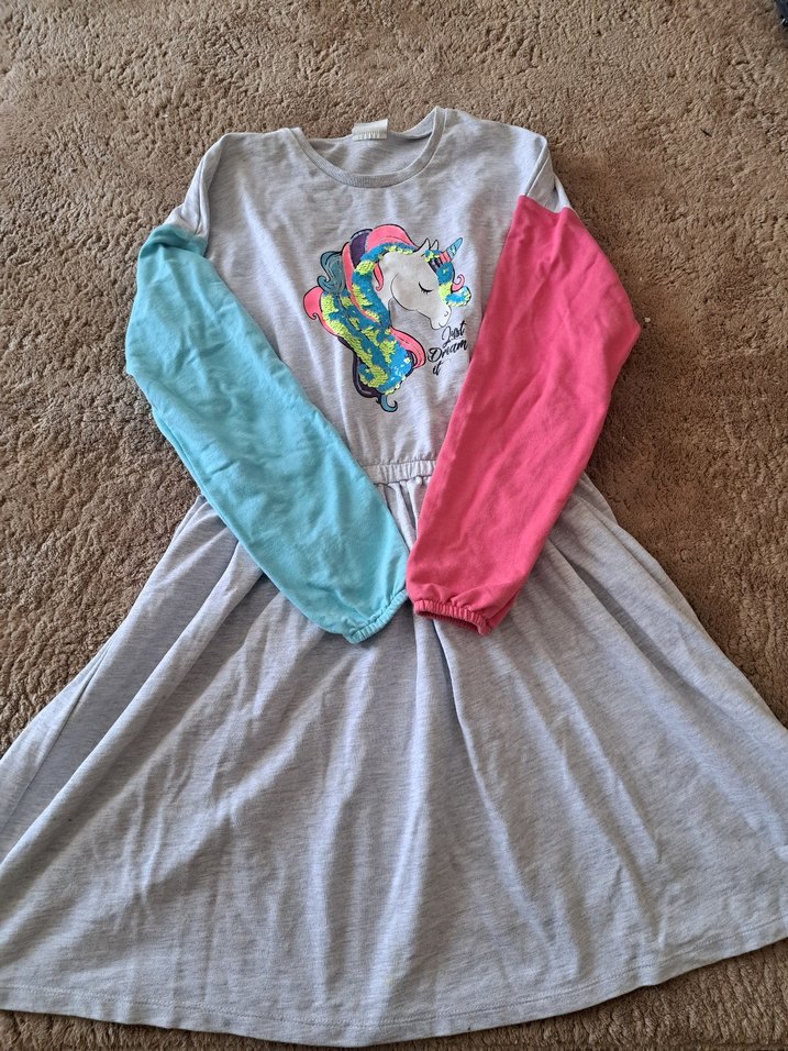 Gri gövdesi ve mavi ile pembe uzun kollara sahip kız elbisesi. Rahat kesim, yuvarlak yaka ve önünde unicorn baskısı bulunur. Yumuşak ve sıcak kumaştan, drapeli etekli.