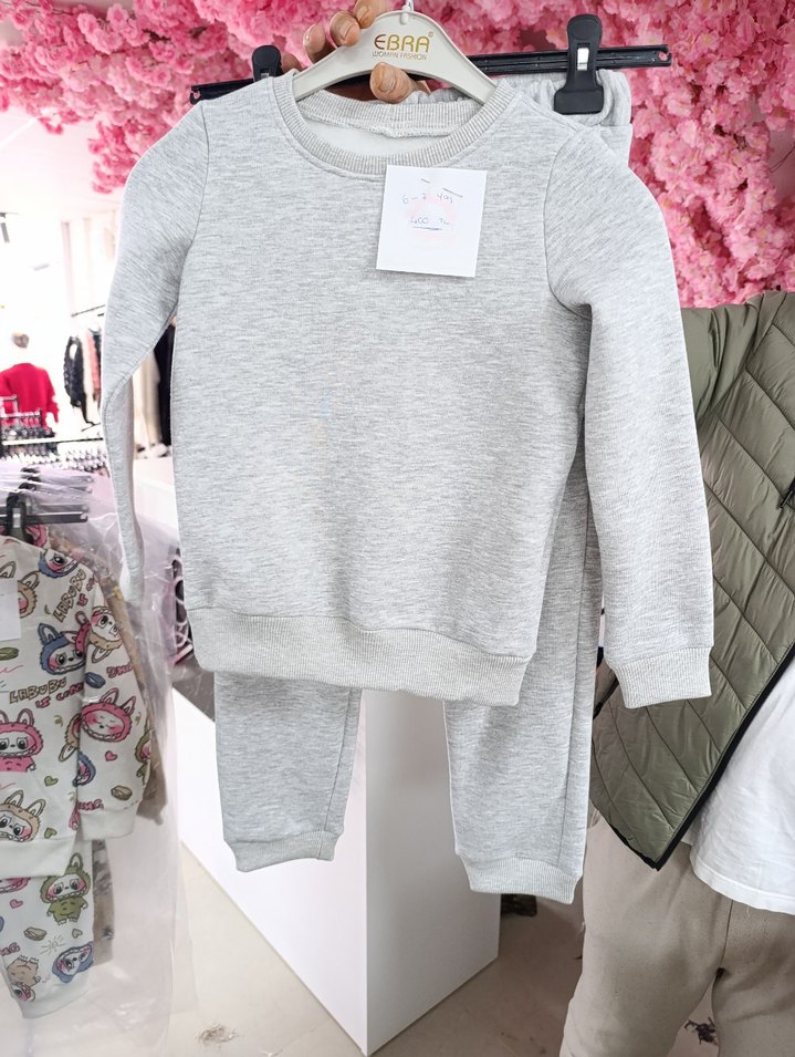 Gri renkli uniseks sweatshirt ve eşofman takımı, bol kesim, uzun kollu ve yuvarlak yaka. Yumuşak ve sıcak kumaştan, rahat sokak stili için tasarlanmıştır. Desensiz ve EBRA markalı. 4-5yas 6-7yas 8-9 yaş mevcuttur