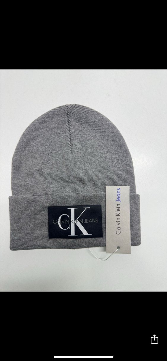 Yumuşak polar dokusuyla gri renkli, Calvin Klein Jeans etiketli, triko kadın bere. Rahat sokak stili için uygundur.