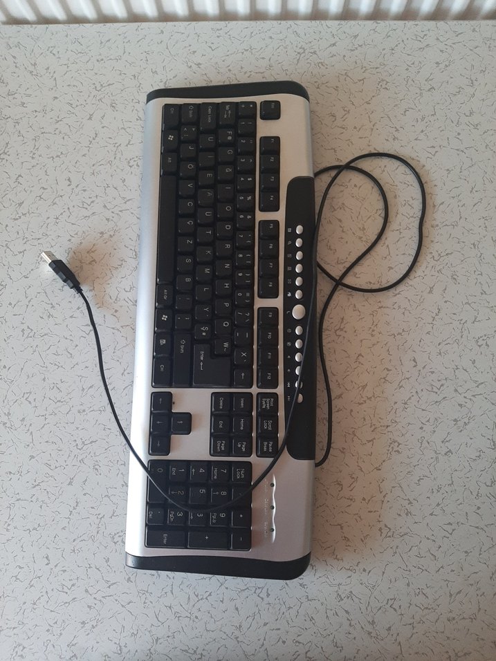 USB bağlantılı, çoklu medya tuşlarına sahip gri kablolu F klavye. Siyah ve gri tuşlar ile kompakt tasarım. Everst marka Cok az kullanıldı