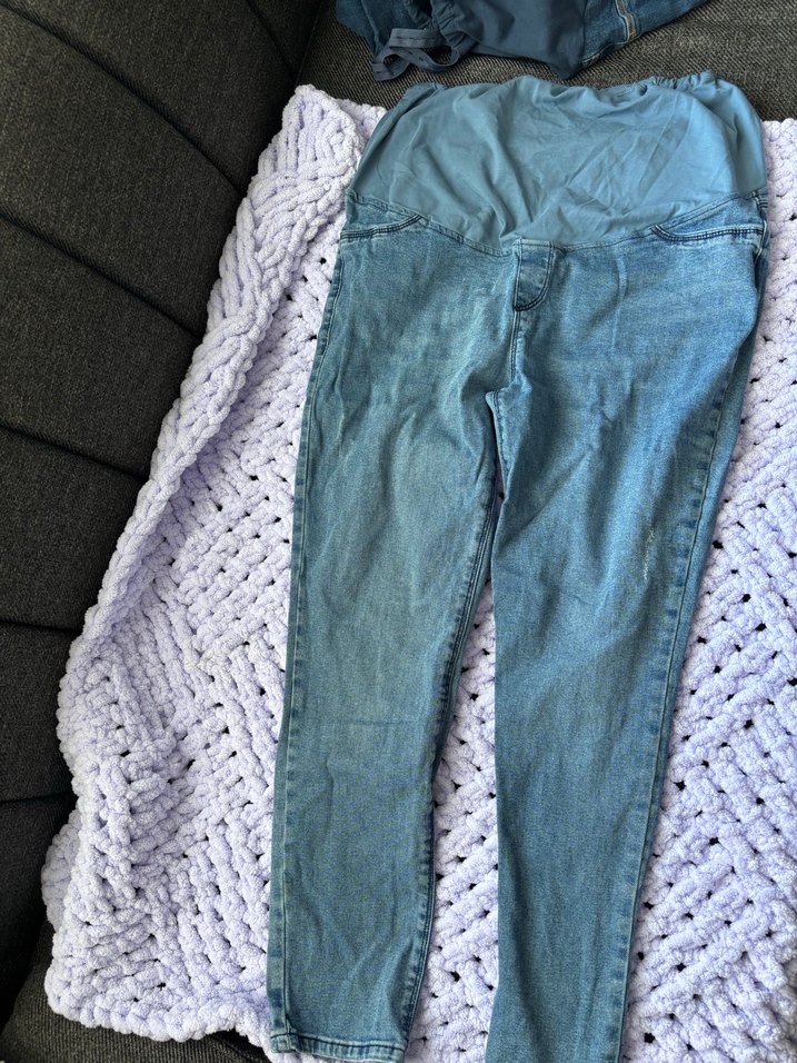 Gri esnek üst bandı ve fermuarlı detayları olan, normal boy ve bol kesim mavi hamile kot pantolon. Günlük rahat kullanım için uygundur. Bir kez giydim erken doğum yapınca fırsat olmadı