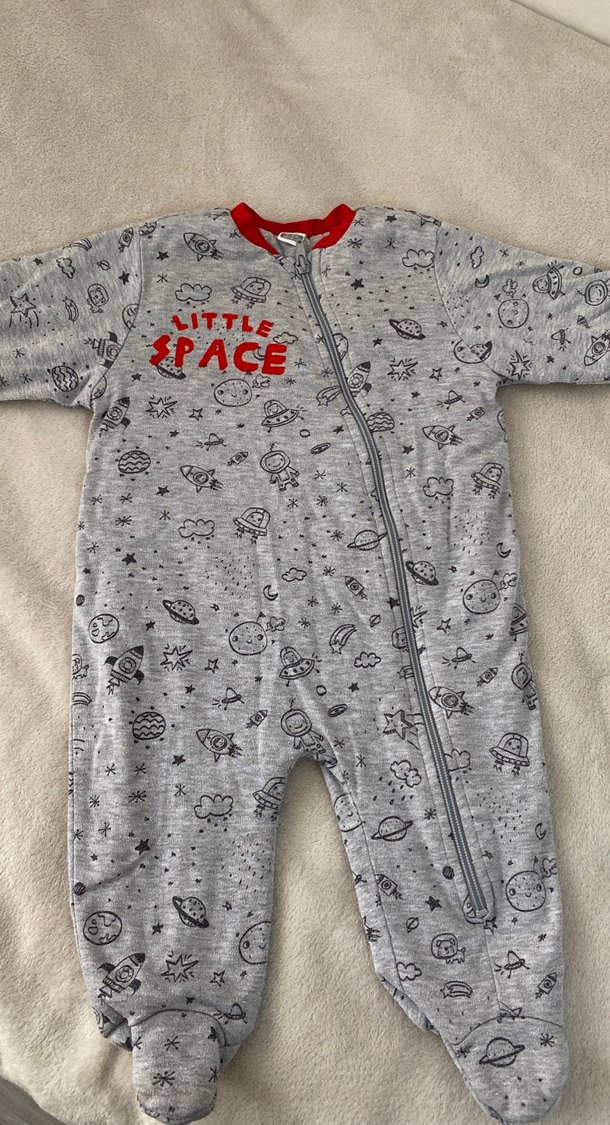 Gri renkli, uzay temalı baskılı, fermuarlı ve yuvarlak yakalı bebek tulumu. Yumuşak ve sıcak kumaştan, uzun kolludur.
