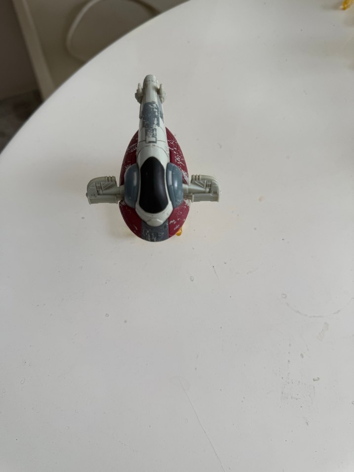 Gri ve kırmızı renklerde uzay gemisi aksiyon figürü, detaylı kanatlar ve kokpit içerir, dayanıklı malzemeden yapılmıştır.