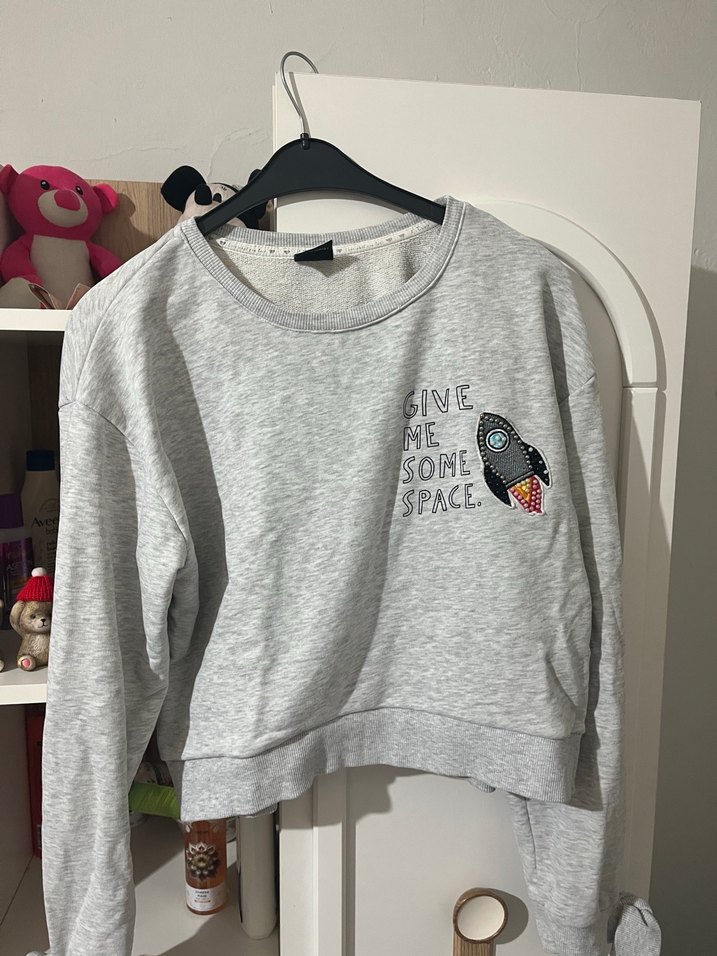 Gri renkli, yuvarlak yaka ve uzun kollu sweatshirt. Yumuşak kumaştan, bol kesimdir. Üzerinde 'GIVE ME SOME SPACE' yazılı, örme roket baskısı bulunur. Rahat günlük kullanım için uygundur.