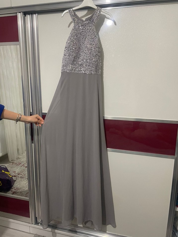 Kolsuz, yüksek yakalı ve drapeli, klasik kesim gri uzun abiye elbise. Düğünler için modern ve şık bir tercih.