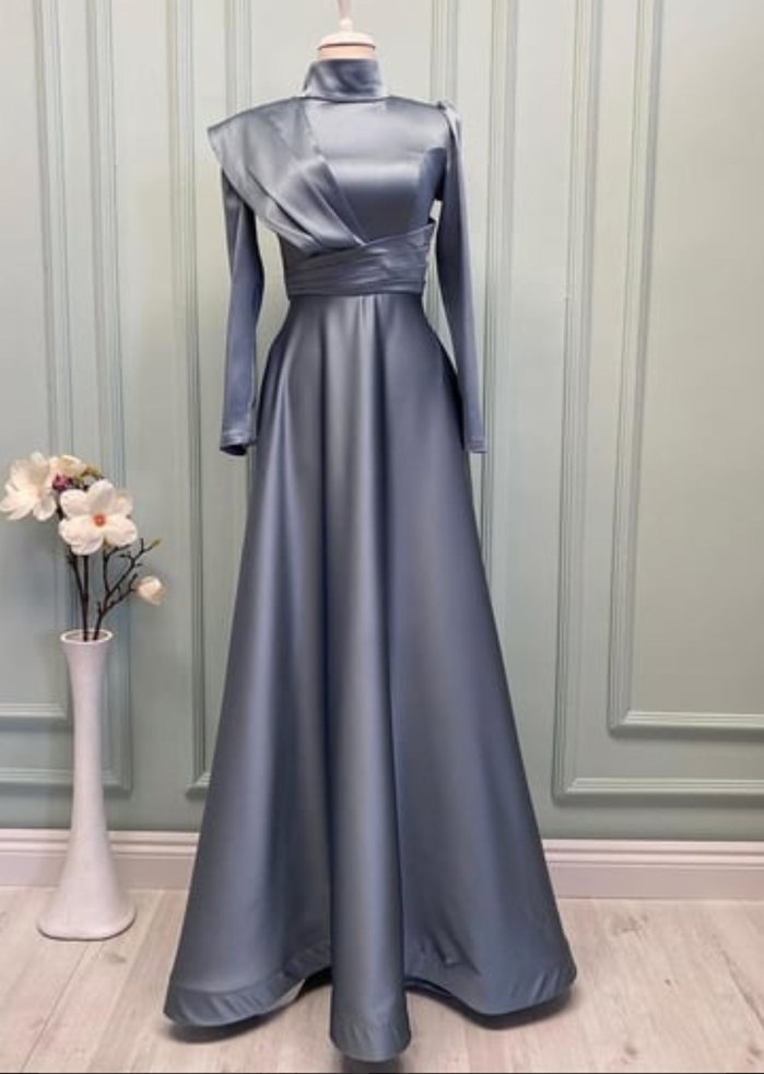 Gri renkte, uzun kollu ve tek renk, drapeli detaylı, kayık yaka uzun abiye elbise. Modern klasik tarzda, düzenli kesimle şıklık sunar.