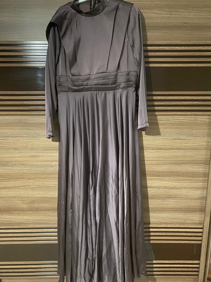 Gri Uzun Abiye Elbise Yüksek Yaka