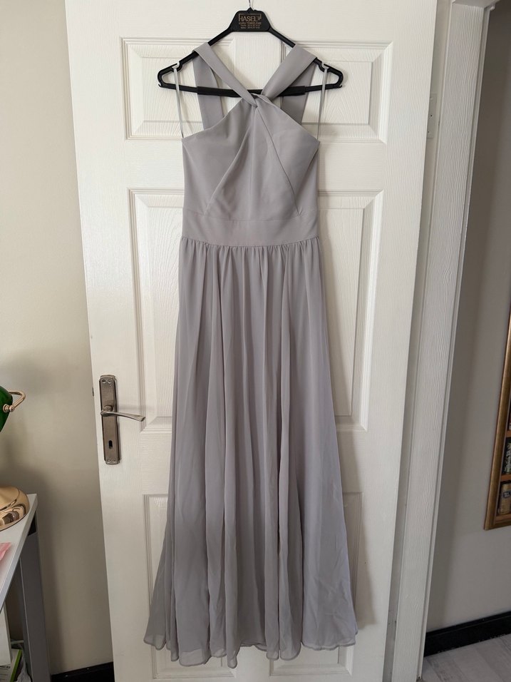 Bu uzun gri abiye elbise, askılı ve drapeli üst kısmı ile dikkat çeker. Rahat kesimi ve akışkan eteği, düğün ve özel davetler için uygundur. Minimalist ve modern klasik tarzda tasarlanmıştır.