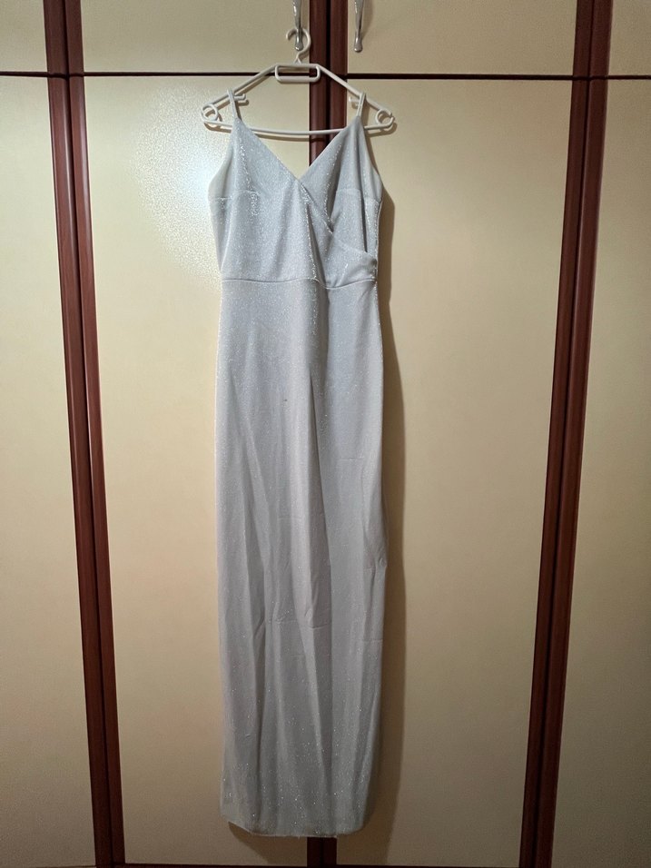 Bu uzun, askılı ve drapeli tasarımlı abiye elbise, v yaka ve gri renkte, klasik şıklığı yansıtır. Düğün için uygundur. Simli ışıltılı bir kumaşa sahip. Trendyol markalı/ 34 beden Yırtmacı mevcuttur