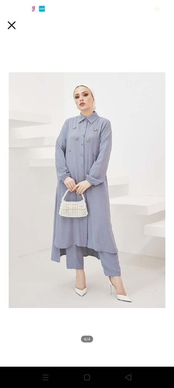 2,3 kez kullanıldı Gri renkte,uzun ve regular fit kadın takım Düğmeli, uzun kollu,islemeli ve notched yaka detayıyla sade ve günlük kullanıma uygun terletmeyen kumaş.