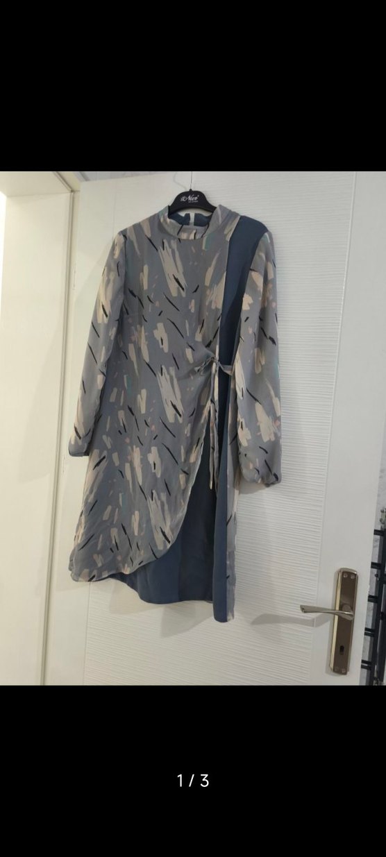 Yüksek yakalı, uzun kollu, bol kesim gri uzun hamile kabanı. Dökümlü ve bağcıklı, batik desenli, yumuşak sentetik kumaştan yapılmıştır.