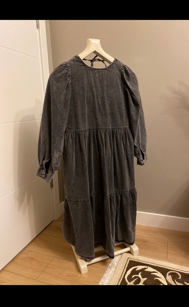 Bu uzun gri elbise, bol kesim ve fırfır detaylara sahip. Yumuşak keten kumaştan, bohem ve vintage tarzında, yüksek yakalı ve uzun kolludur.