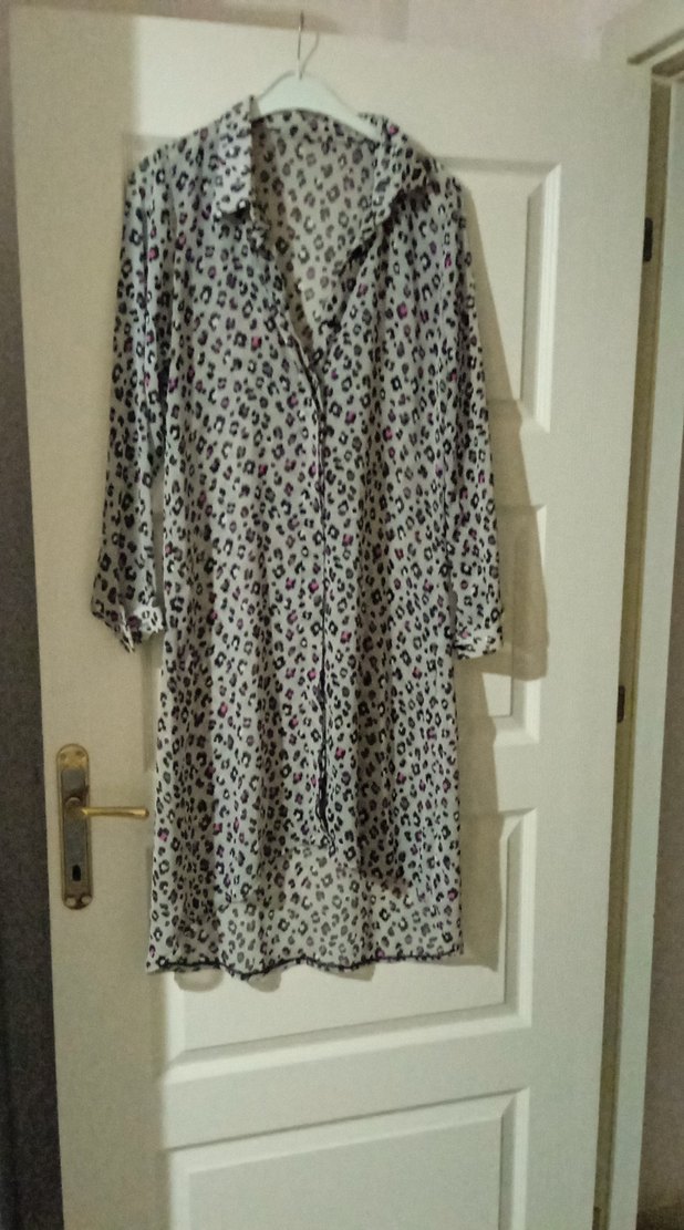 Kadınlar için uzun, bol kesim ve uzun kollu sabahlık. Gri renkte, minimalist bohem tarzda ve hafif batik desenlidir. ️
