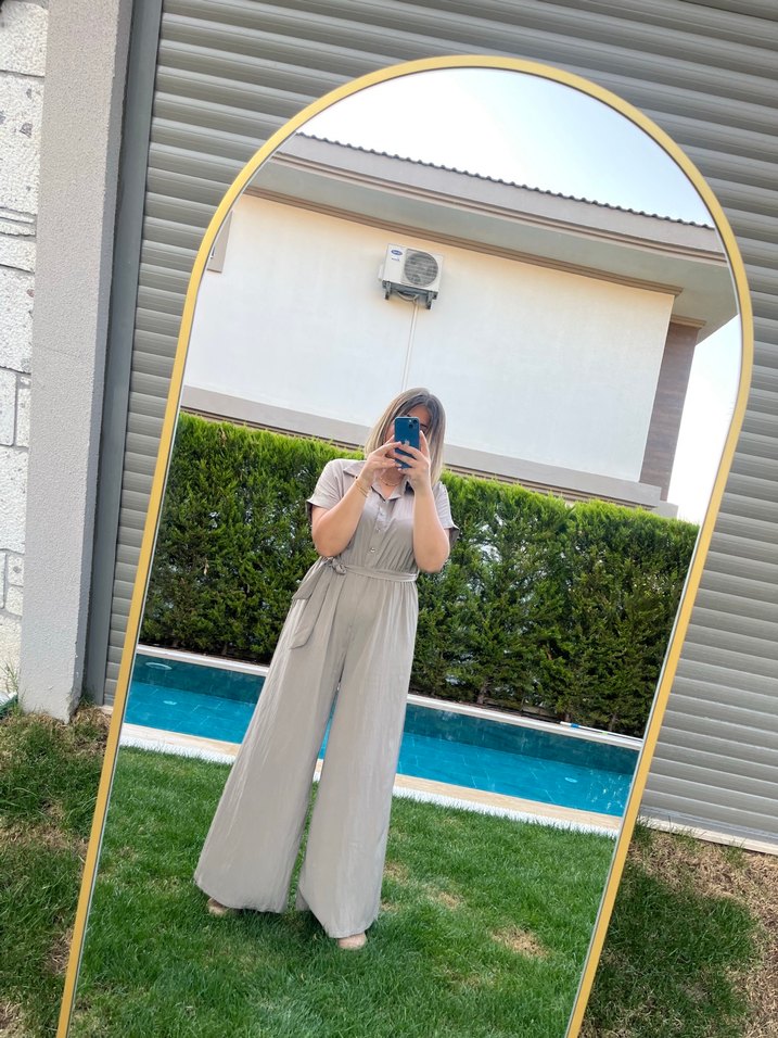 Gri renkli, uzun ve bol kesim tulum, düşük kollu, V yaka ve cep detaylıdır. Yumuşak sentetik kumaştan üretilmiş, rahat dış mekan kullanımı için uygundur.
