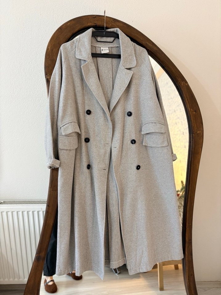 Gri uzun kesim kadın keten kaban, düğmeli ön ve kesik yaka detaylarına sahiptir. Yumuşak kumaştan, bol kesim ve uzun kolludur. Günlük rahat kullanıma uygundur.