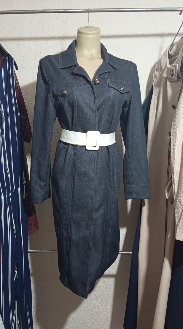 Gri renkli uzun denim kaban, düğmeli ve kesimli yaka detaylarına sahiptir. Regular fit ve uzun kolludur, günlük ve iş tarzına uygundur.
