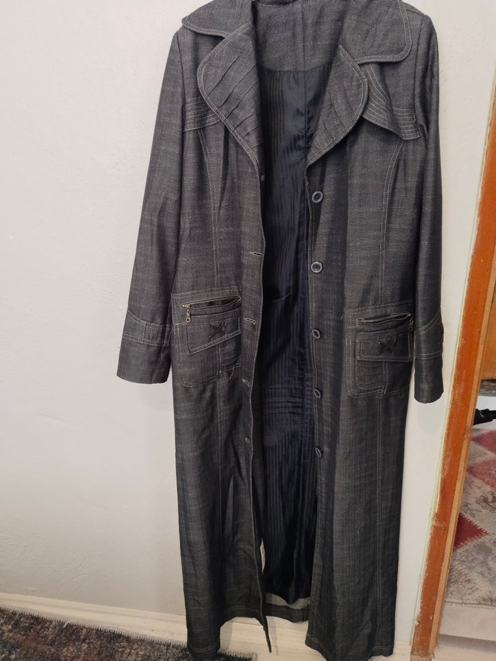 Gri renk uzun denim kaban, düğmeli ve kesimli yaka detaylıdır. Regular fit ve uzun kolludur, günlük ve sokak stiline uygundur.