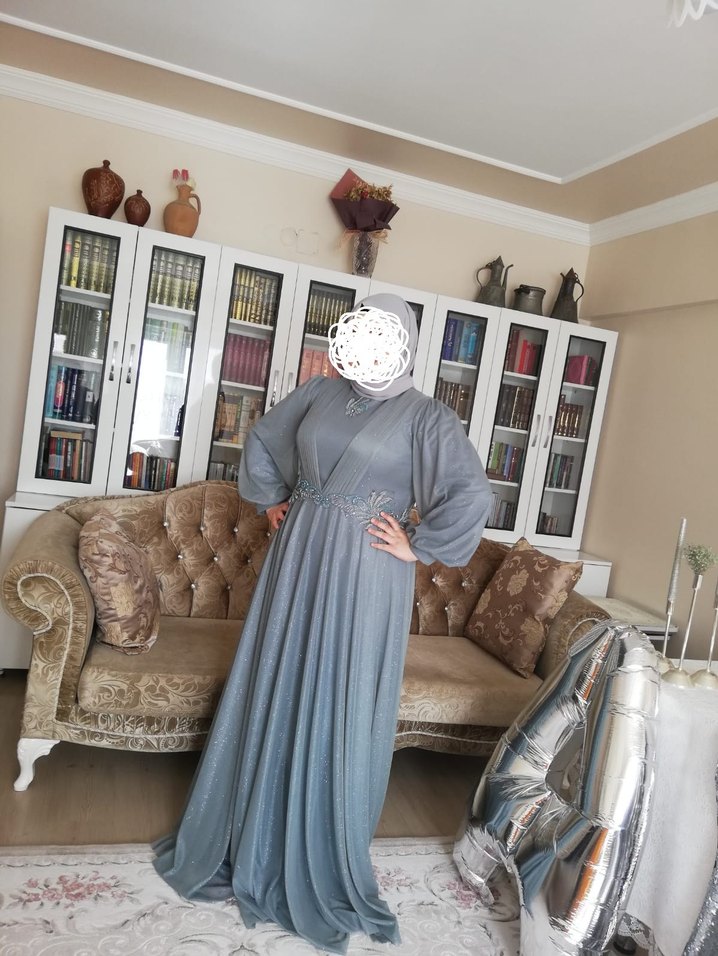 Su yesili gri arası bir renk , yüksek yakalı ve uzun kollu, bol kesim drapeli uzun abiye elbise, düğün gibi özel günler için uygun. ✨ 5 saat sözümde giydim onun dışında hiç kullanılmadı Şalı 150 tl