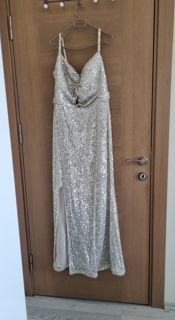 Drapeli ve straplez tasarıma sahip, fitted kesim uzun gri abiye elbise. Parlak kumaşıyla düğün ve özel davetler için uygundur. Kolsuz ve şık bir model. ✨