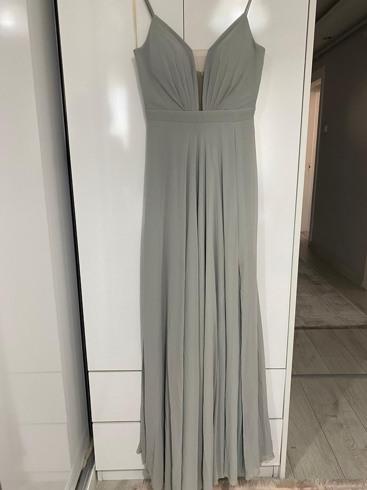 Gri renkte, ince askılı, drapeli tasarıma sahip, sentetik kumaştan uzun. Modern klasik ve minimalist tarzda Abiye elbise. 1 sefer kullanıldı.Sorunsuz tertemizdir. Alsancak da mağazadan 7500 ₺ ye alınmıştır.