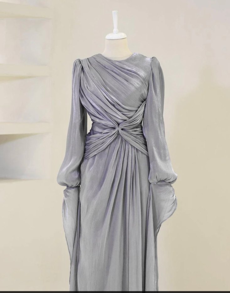 Gri renkli, yüksek yakalı ve uzun kollu, drapeli tasarıma sahip, bol kesim uzun abiye elbise. Elbise boyu 140cmdir, şal dahildir, 36 bedene uygundur