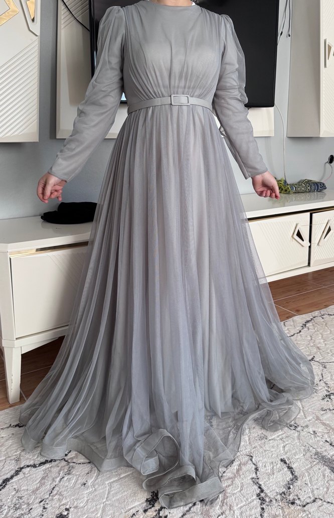 Gri Uzun Drapeli Kadın Abiye Elbise