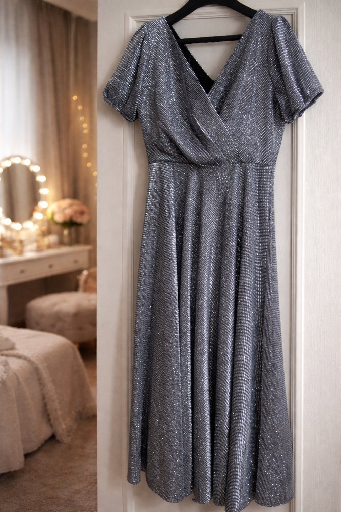Gri renkli, uzun ve drapeli tasarıma sahip, V yaka ve askılı kollu kadın abiye elbisesi. Salaş kesimi ve modern klasik stiliyle düğün için uygundur. ✨