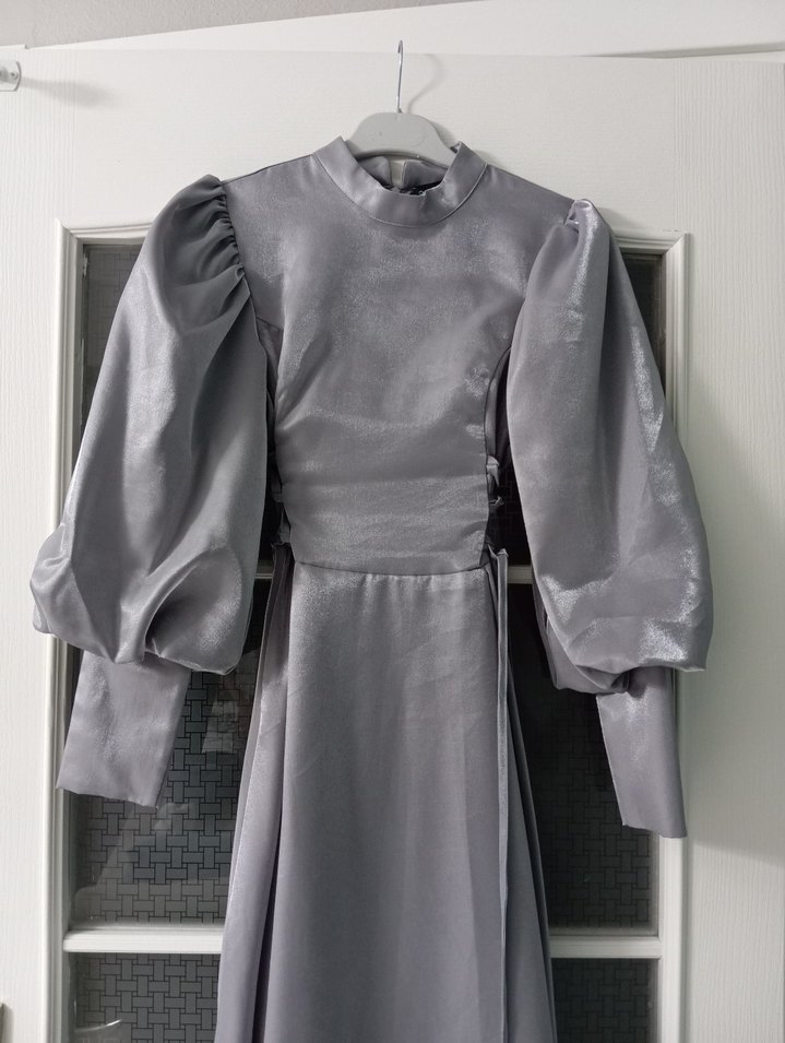 Gri renkte, yüksek yakalı ve uzun balon kollu, sentetik kumaştan yapılmış uzun elbise. Drapeli tasarımı ve regular kesimi ile düğün ve avangart tarzlar için uygundur.Sadece 1 kez giyildi.