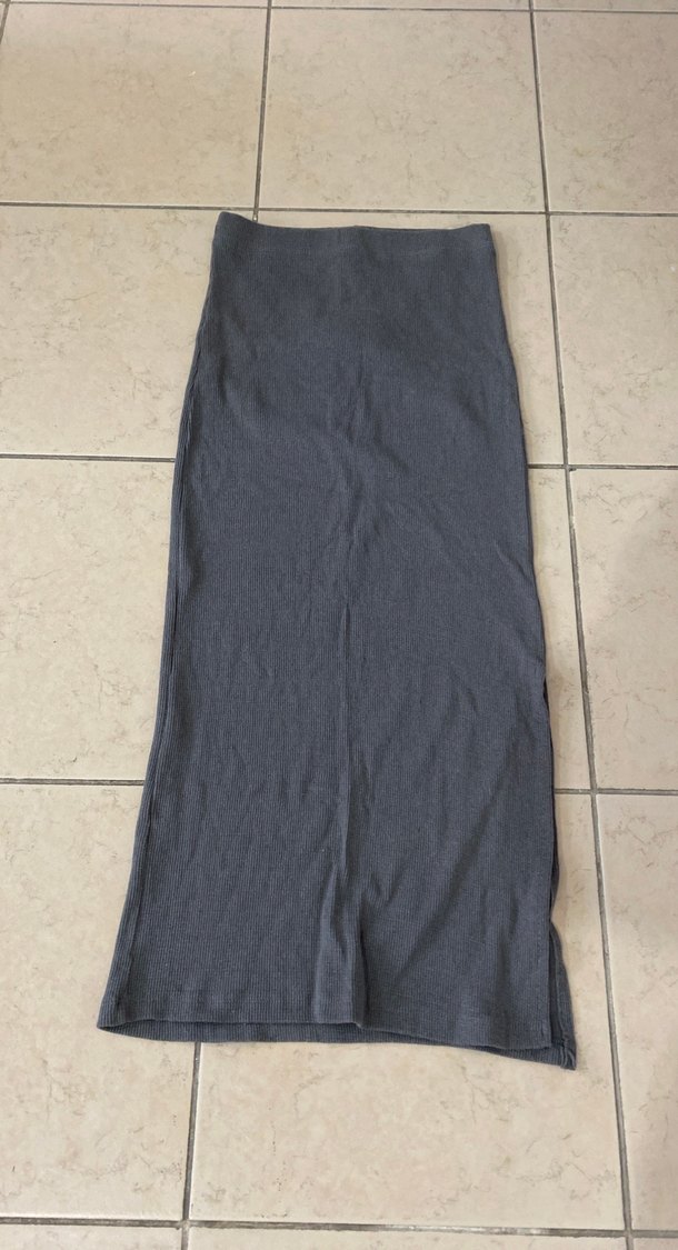 Sentetik kumaştan, drapeli tasarıma sahip, gri uzun ve vücuda oturan kadın eteği, sade ve minimalist tarzda, günlük kullanım için uygundur.